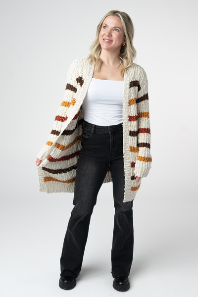 Okay, this cardigan is SOFT! These have really good stretch, and fit a tad oversized by design (model liked her usual size, size small shown here). The fabric has good weight to it, making it extra cozy!