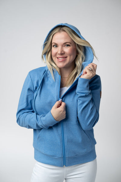 Fall in love with this basic fullzip hoodie. Perfect for layering or wearing solo, the cuff sleeves add a polished finish while keeping things casual and comfortable. The perfect hoodie to take to the beach, wear by the fire on camping nights, or throw on while taking walks around the neighborhood.