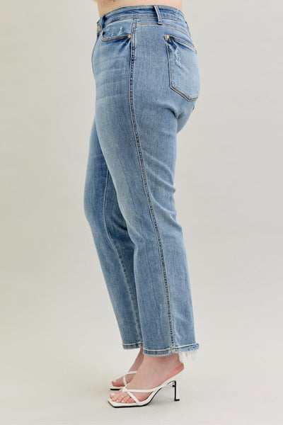 The Judy Blue Quinn Mid Rise Yoke Cell Phone Pocket Dad Jeans from Judy Blue are perfect for on-the-go lifestyles! You can now keep your phone in a secure pocket without compromising comfort. With a mid rise, light wash, and straight cut, this timeless style is sure to become your new favorite. So why wait? Get your Quinn jeans today!