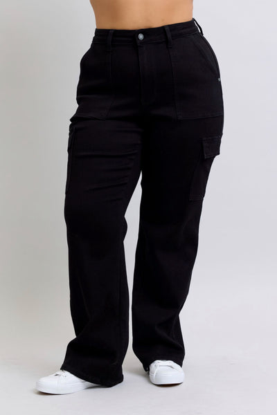 Step into bold comfort with the Judy Blue Keira High Waist Cargo Wide in Black. These playful, high-rise pants feature a zip fly and handy cargo pockets for easy storage. The non-distressed fabric keeps the look sleek, while the wide silhouette adds a fun, relaxed vibe to your outfit. Perfect for making a statement with effortless style!