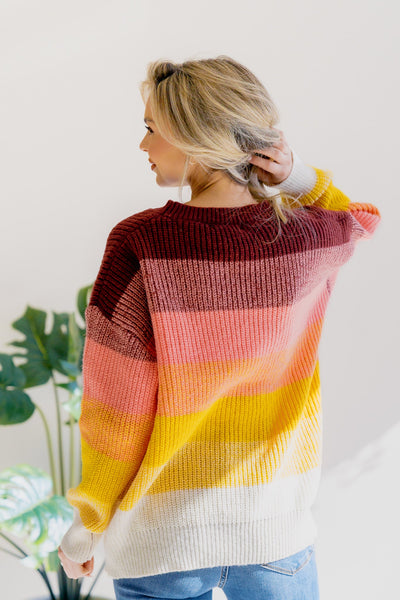 Enjoy cozy comfort and casual charm with our Lustrous Rose Block Sweater. Made from gentle knit fabric, it includes a round neckline and long sleeves. The colorful striped pattern brings a fun and lively feel to your essential winter wear.