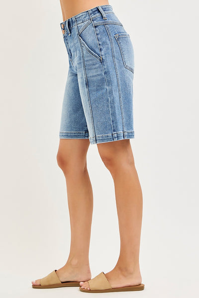 These high-waisted wide-leg denim shorts offer a stylish and comfortable option for warm weather. Crafted from durable denim, they feature a flattering high-waisted design and a fashion wide-leg silhouette. The unique panel detailing and double button closure add a touch of sophistication. Perfect for casual outings or dressing up with a blouse, these denim shorts are a versatile addition to any wardrobe. The light wash denim provides a relaxed and effortless look.