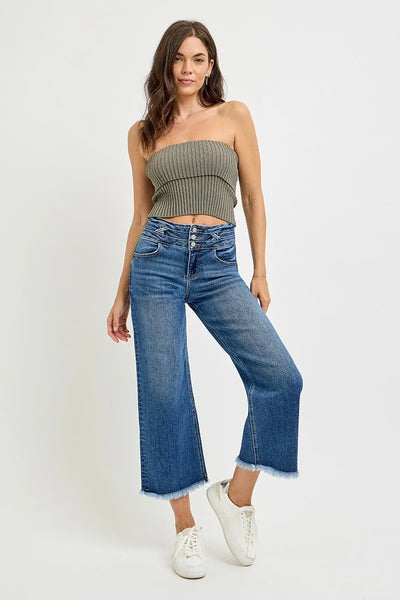 The High Rise Crop Wide Leg Jeans with Wide Band Detail are the perfect blend of style and comfort. These jeans feature a trendy high-rise fit and wide leg design. The wide band detail adds a unique touch to this classic wardrobe staple. Effortlessly chic, these jeans will elevate any outfit with their modern silhouette.
