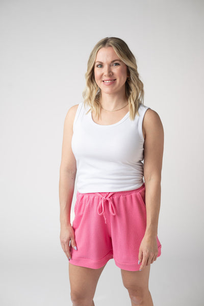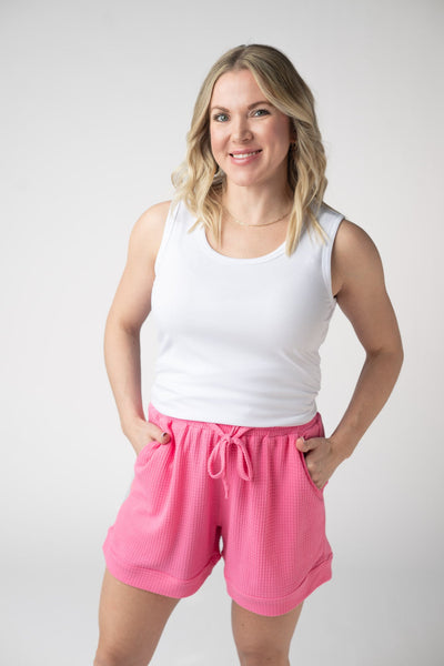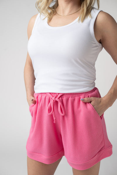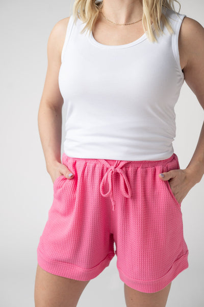 Stay cool and comfy all season long in these Weslie Waffle Shorts. The lightweight waffle fabric keeps you breezy on hot days, while functional pockets give you a place for your essentials. Adjustable drawstring lets you dial in the perfect fit, and bold thick trim detailing adds a fun, polished touch. Your new summer go-to.