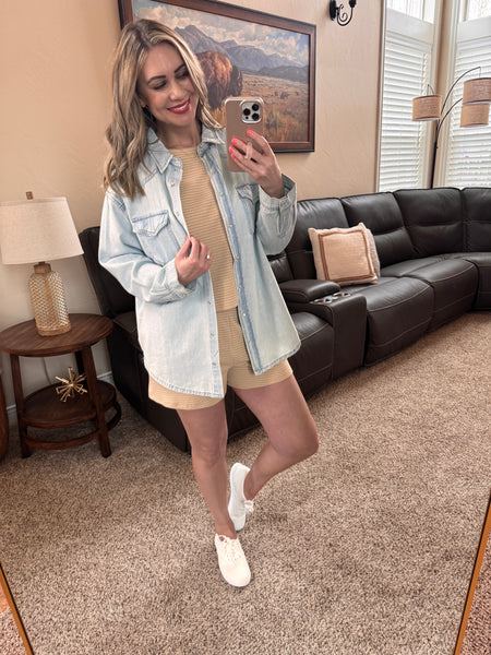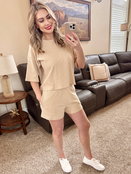 Effortless comfort meets everyday style in this soft woven knit lounge set by Double Zero. Designed in a neutral sandstone stripe, this set is perfect for slow mornings, cozy nights, or running quick errands while still feeling put together.