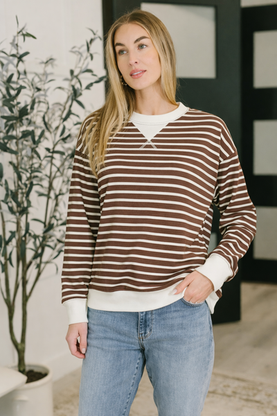 Zenana Contrast Striped Round Neck Sweatshirt Brown