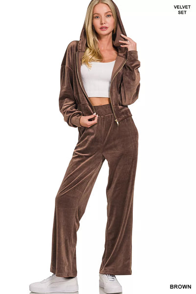 This velvet zip-up hoodie and pants set is a luxurious and stylish choice for staying cozy and chic. The plush velvet fabric adds a touch of glamour and sophistication to this casual ensemble. The zip-up hoodie offers comfort and warmth, while the matching pants provide a sleek and coordinated look. Perfect for lounging at home or running errands in style, this set is a versatile addition to your wardrobe. Elevate your loungewear game with this trendy and comfortable velvet set!